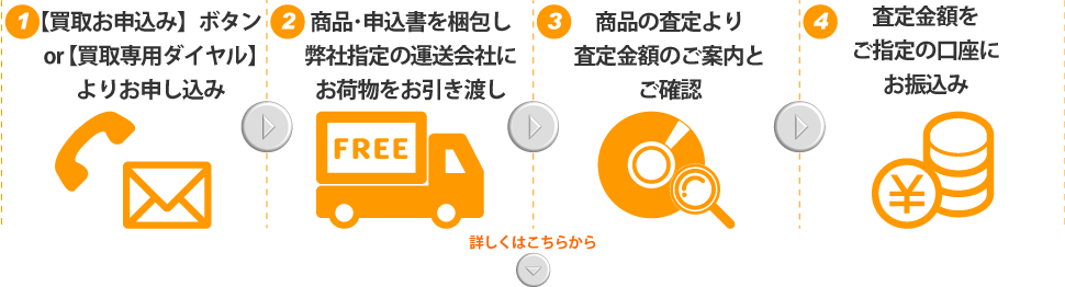 下記の【 買取お申込み 】ボタンもしくは、【 買取専用ダイヤル】よりご売却をご希望の商品の情報をご連絡下さい。